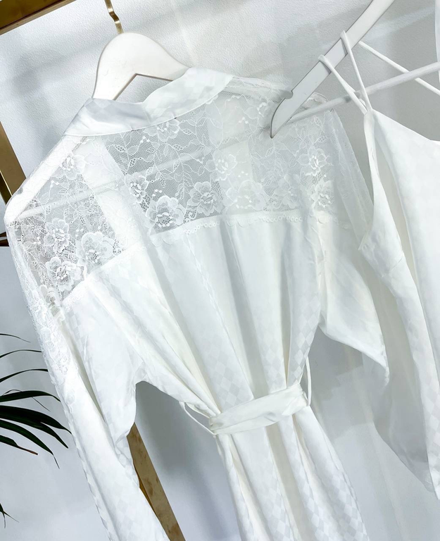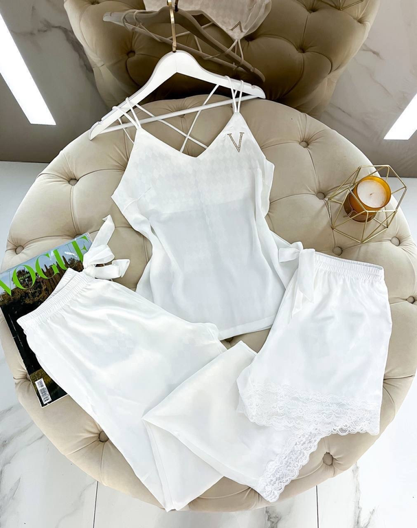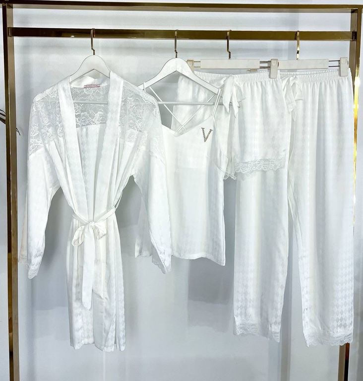 Домашняя одежда в стиле Виктория Сикрет. Стильный, модный домашний комплект для сна и отдыха. Халат, брюки, шорты декорированы мягким кружевом, майка декорирована стразами.