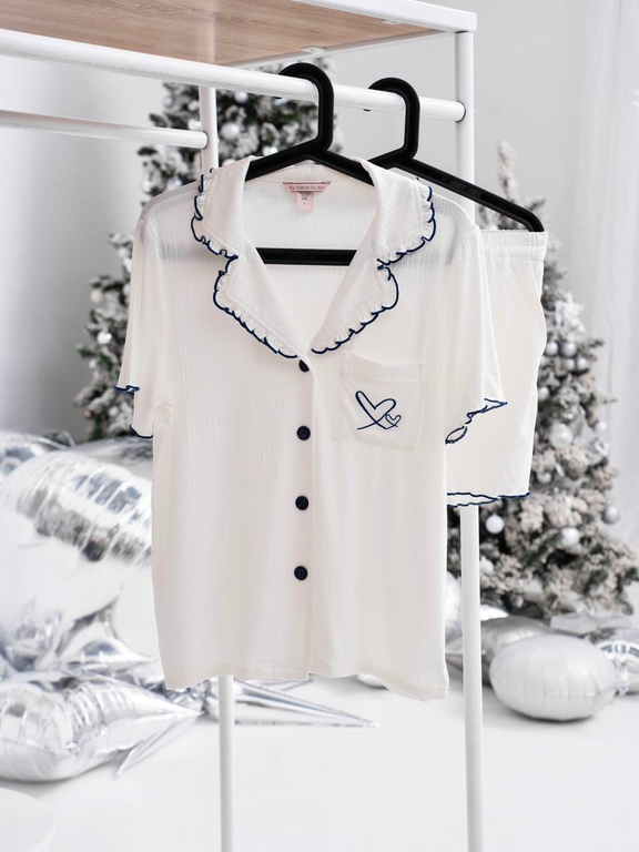 Комплект рубашка и шорты подходят для дома и сна. Рубашка и шорты с синим кантом, на воротнике рюши.