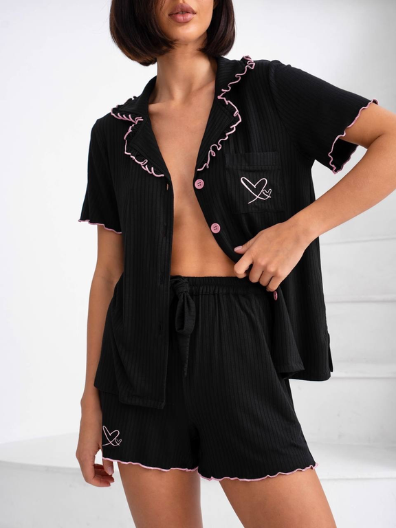 Комплект рубашка и шорты подходят для дома и сна. Рубашка и шорты с розовым кантом, на воротнике рюши.