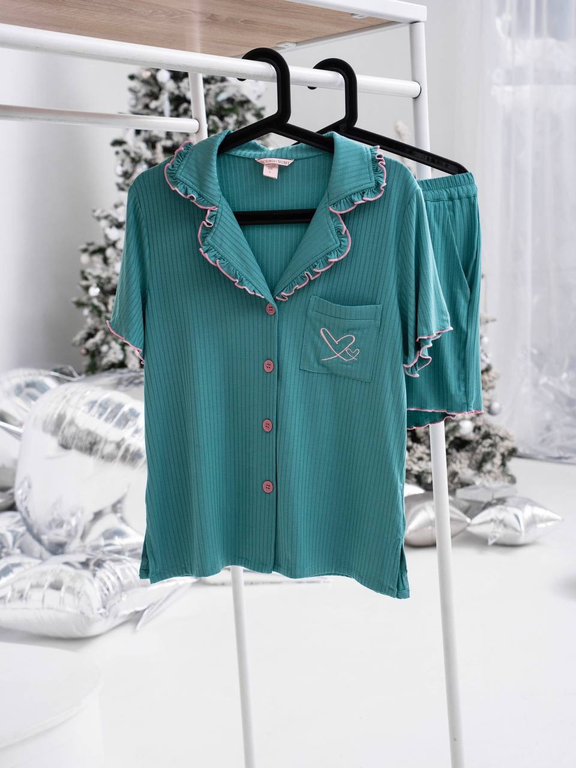 Комплект рубашка и шорты подходят для дома и сна. Рубашка и шорты с розовым кантом, на воротнике рюши.