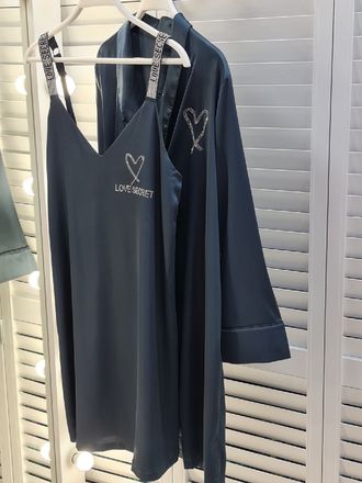 Халат и сорочка Виктория Сикрет из искуственного шелка. Халат декорирован стразами. Бретели на сорочке выполнены из страз с надписью Love Secret. Стразы блестят невероятно красиво.