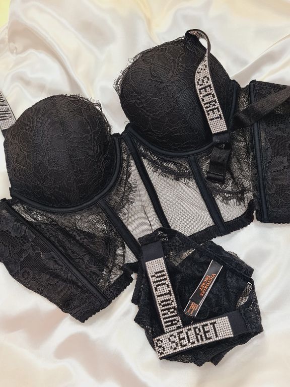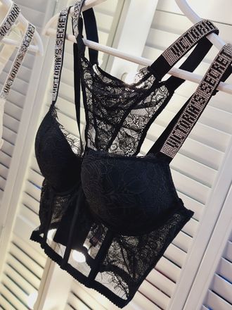 Кружевной комплект нижнего белья Виктория Сикрет со стразами. Бюстгальтер корсет, трусики бразильяна. Стразы красиво переливаются.