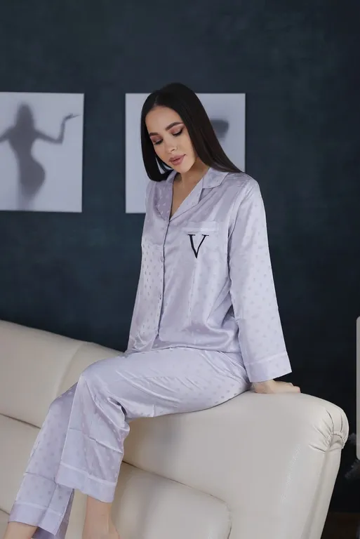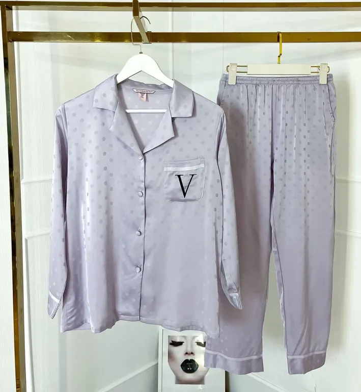 Пижама Виктория Сикрет из искуственного шёлка с рисунком горох. В наборе рубашка и брюки.