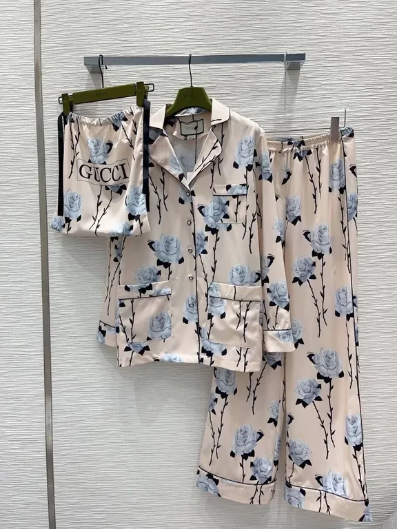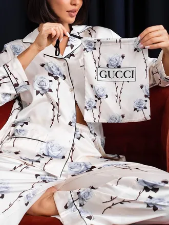 Красивая, уютная пижама в стиле известного бренда состоит из трёх предметов: рубашка, брюки, мешочек тряпичный.