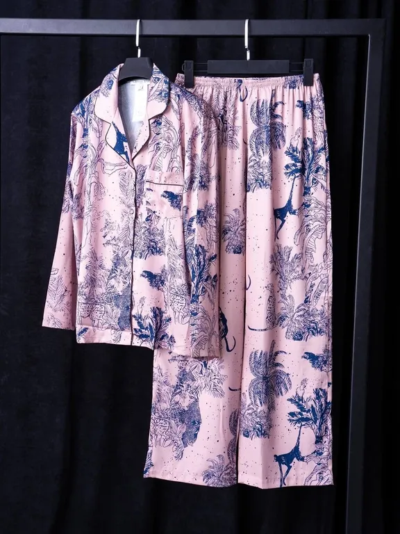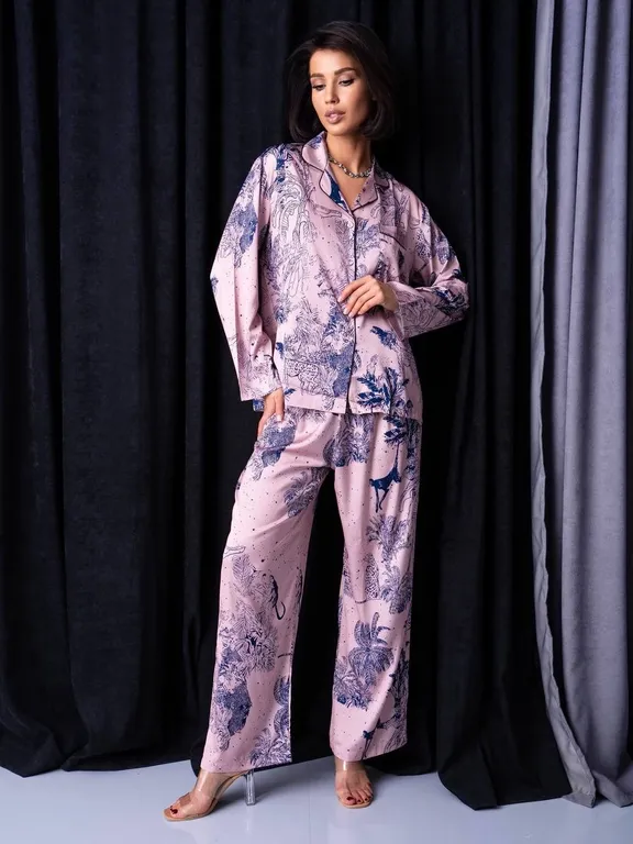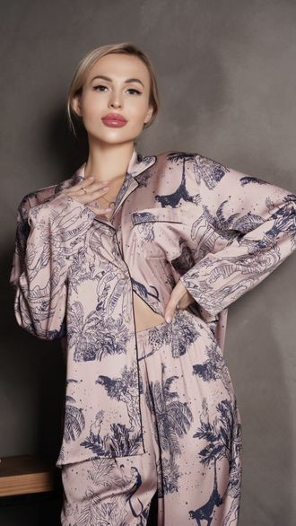 Красивая, уютная пижама в стиле известного бренда состоит из двух предметов: рубашка, брюки