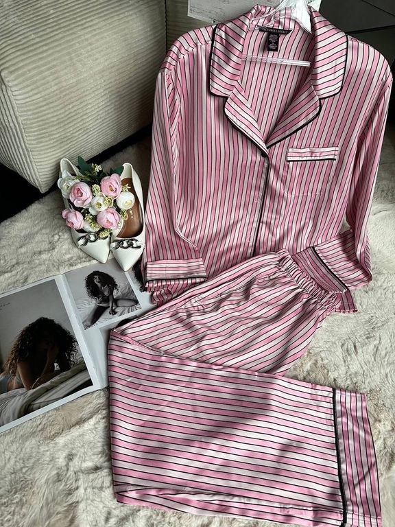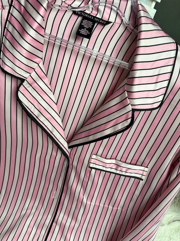 Пижама Виктория Сикрет в бело-розовую полоску с черной атласной окантовкой.