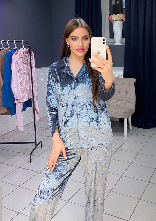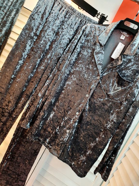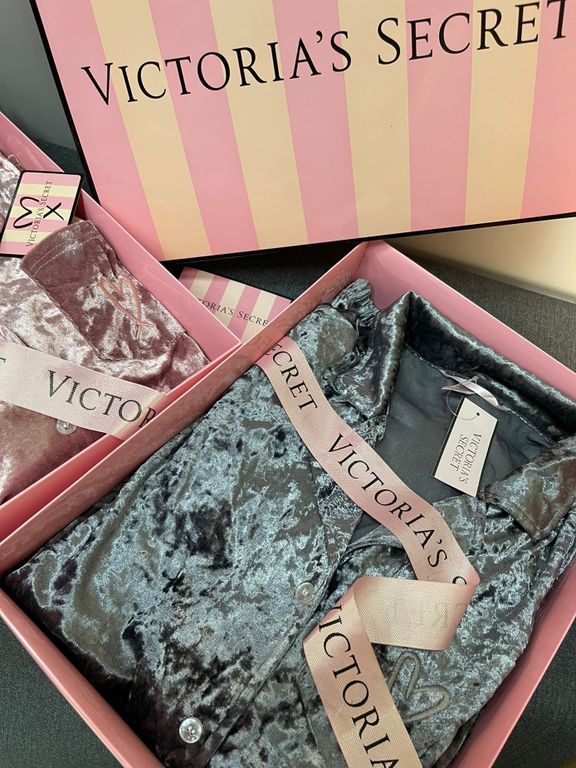 Женская пижама Виктория Сикрет состоит из рубашки и брюк с карманами. Пижама цвета графит.