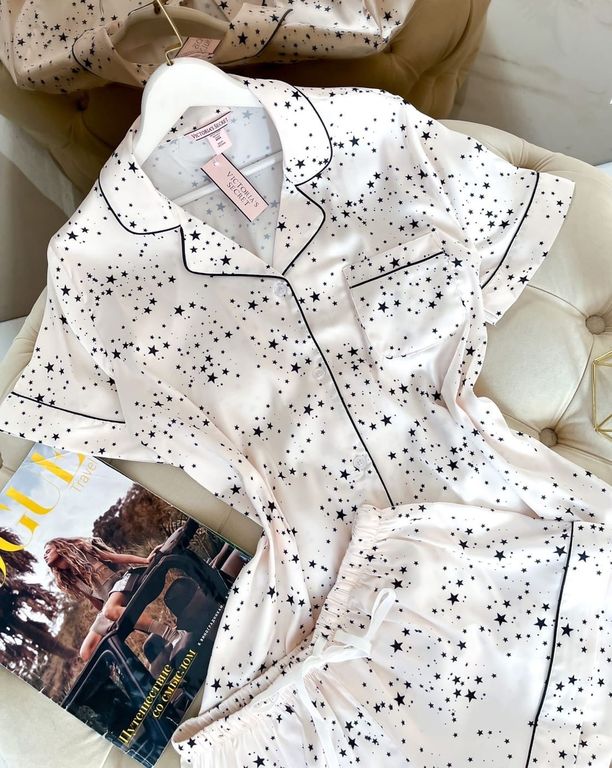 Пижама Виктория Сикрет с рисунком "звезды". Пижама состоит из рубашки и шорт. Уютная, приятная на ощупь пижама Виктория Сикрет из искуственного шелка. Пижама в кремовом цвете. На рубашке небольшой карман.