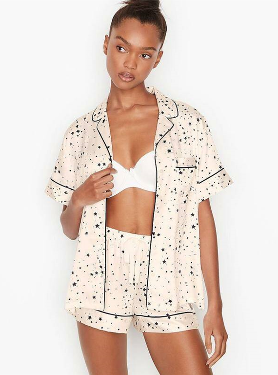Пижама Виктория Сикрет с рисунком "звезды". Пижама состоит из рубашки и шорт. Уютная, приятная на ощупь пижама Виктория Сикрет из искуственного шелка. Пижама в кремовом цвете. На рубашке небольшой карман.