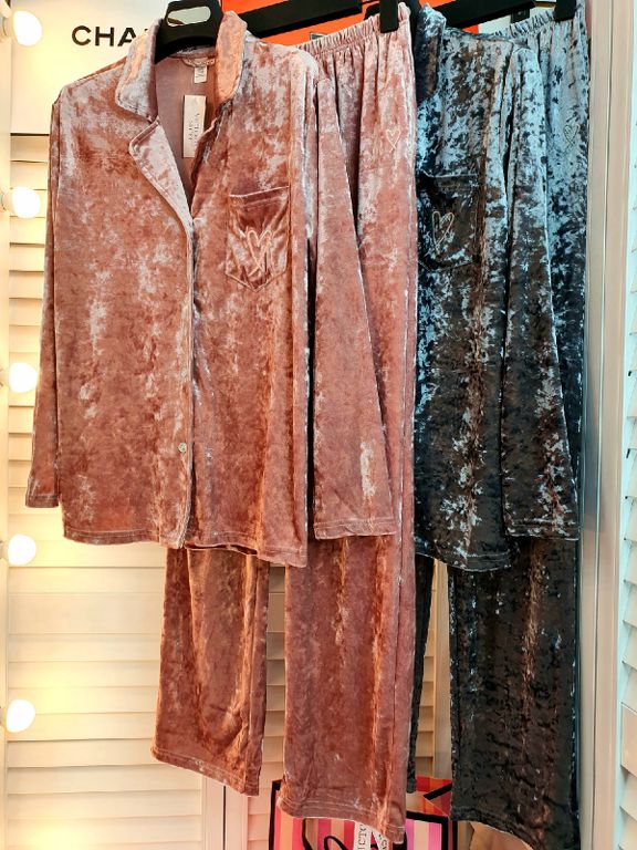Женская пижама Виктория Сикрет состоит из рубашки и брюк с карманами.