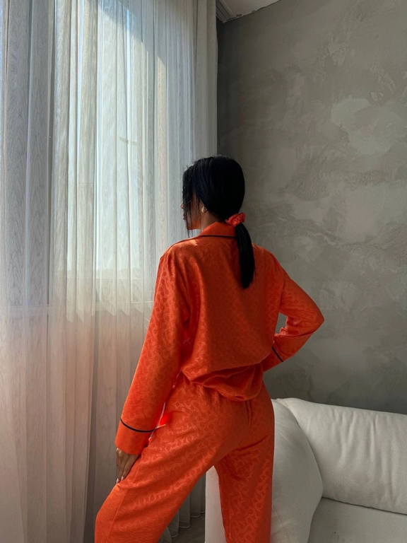Красивая, уютная пижама в стиле известного бренда состоит из трёх предметов: рубашка, брюки, резинка для волос.