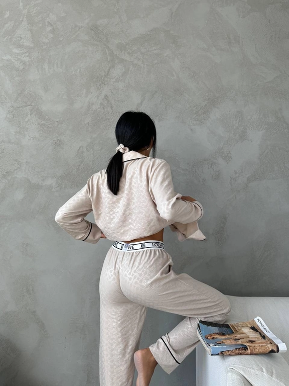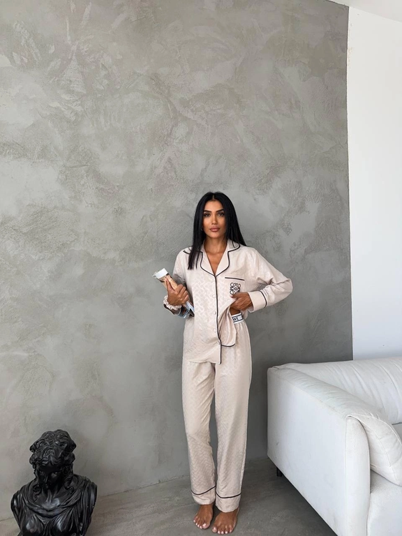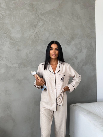 Красивая, уютная пижама в стиле известного бренда состоит из трёх предметов: рубашка, брюки, резинка для волос.